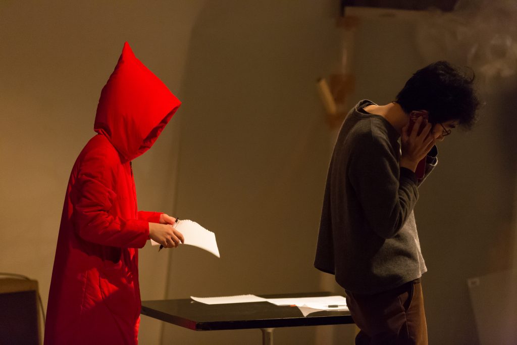 客席左後方には、茶色いパーカーのフードを被り、長い前髪で顔を隠したホラー映画的人物がいる。ホラー的人物は時々携帯電話で指示を呟く。「眉間にしわを寄せたまま笑ってください」。すると左前方に投影された青白い映像の中の男が指示に従う。