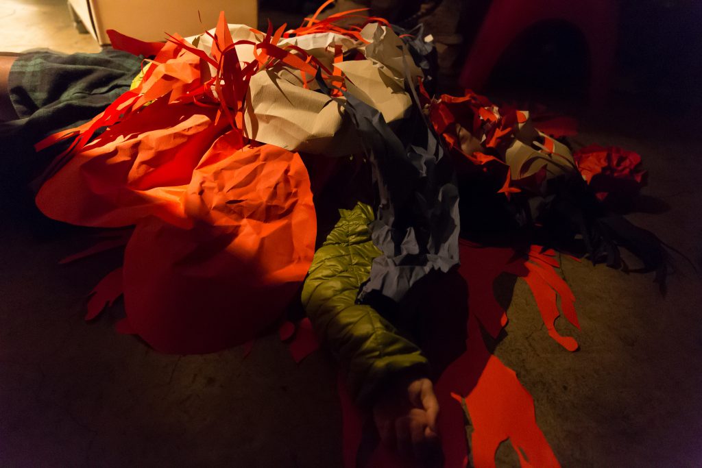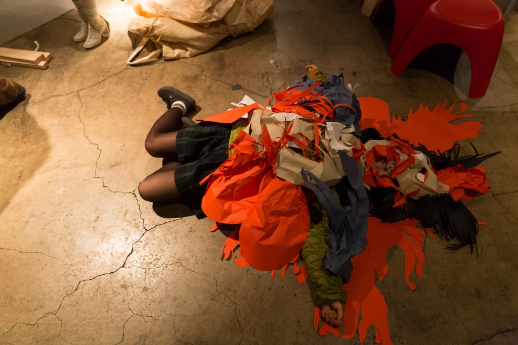 フロアの中心に死体が横たわっている。潰れた顔、切り裂かれた胴体、飛び散る血――紙製の。トム・フリードマンの紙彫刻死体を思わせる(1)。その紙の間に、本物の人が挟まり、薄緑のダウンジャケットに包まれた小さな腕と、黒いストッキングで覆われた両足だけを覗かせている。