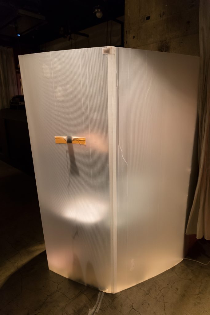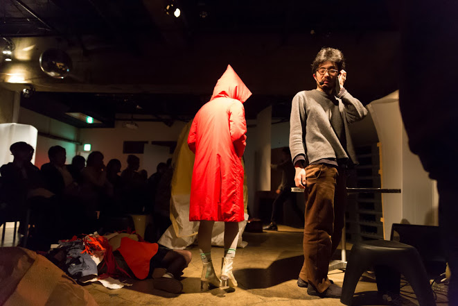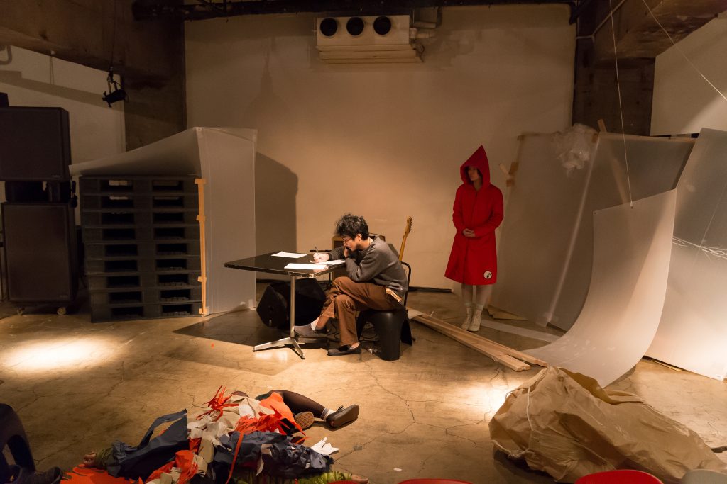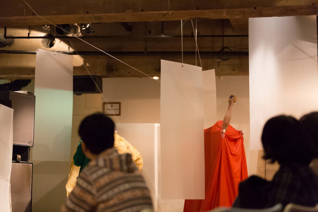 半透明の養生シートが天井から吊るされ、また床に立てられている。養生シートの背後には人影があり、シートを叩いたり、スプレーで水を吹き付けたりしている。間を縫って、背丈程の布製衣装ラックが動き回る。時折中から腕や足がはみだし、「おんどりゃ〜」と怒鳴り声を上げる。フロアの隅では巨大な布団袋ないしガラ袋が人を包んでモゾモゾしている。箱に入ったままの電動ヤスリからコードが伸びている。