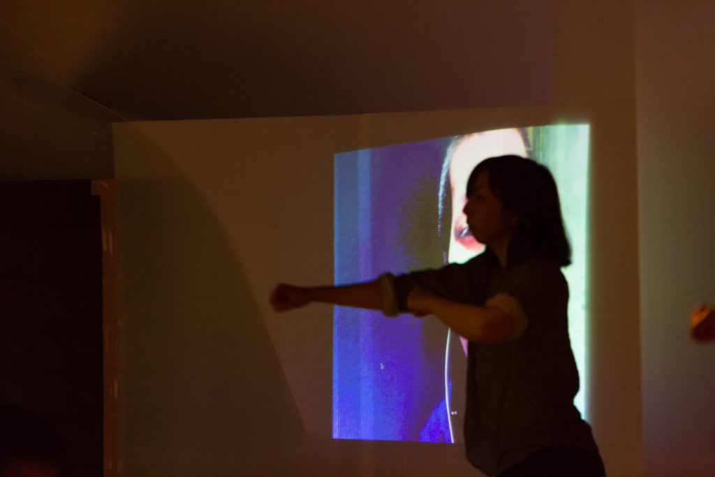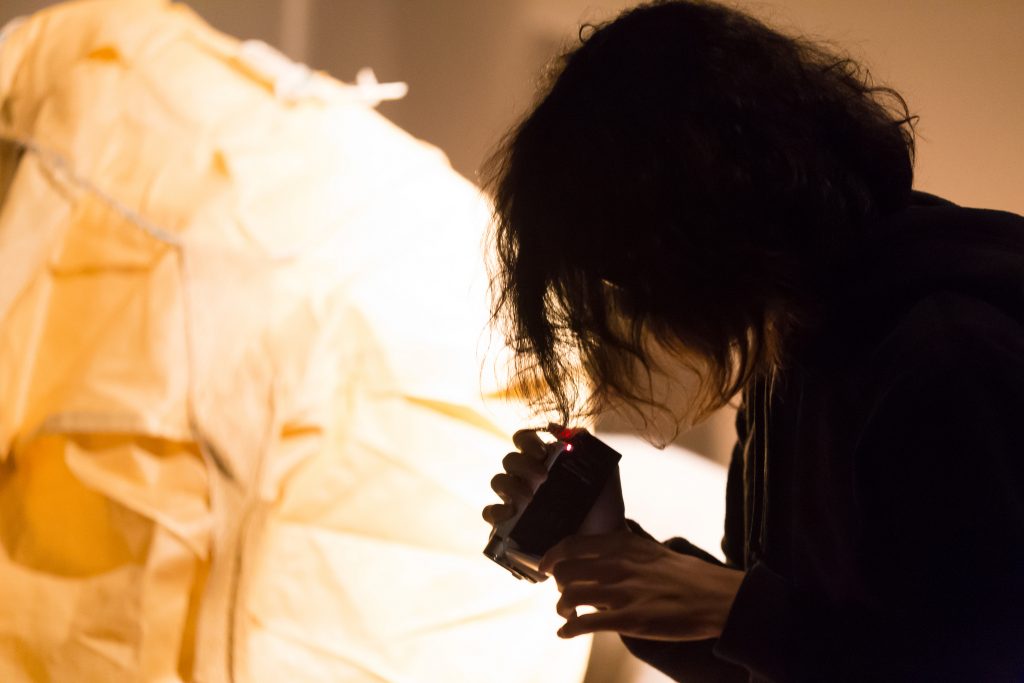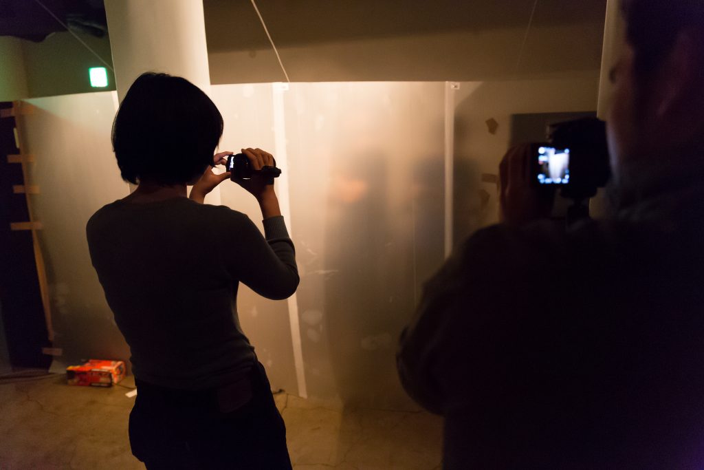 長い「片付け」の時間が過ぎていく。闇の中、ホラー的人物が不意に立ち上がり、使い捨てカメラを客席の方に向ける。ジージージージージ(フィルムを巻き上げる音)……パシャ。強いフラッシュが光る。約20秒間の沈黙と闇。ジージージージージ……パシャ。強いフラッシュ。繰り返し。BPM=約3で起こる眩しい光が、私をその都度、パチンと面的に圧縮する。身体が再び揺れ始める。