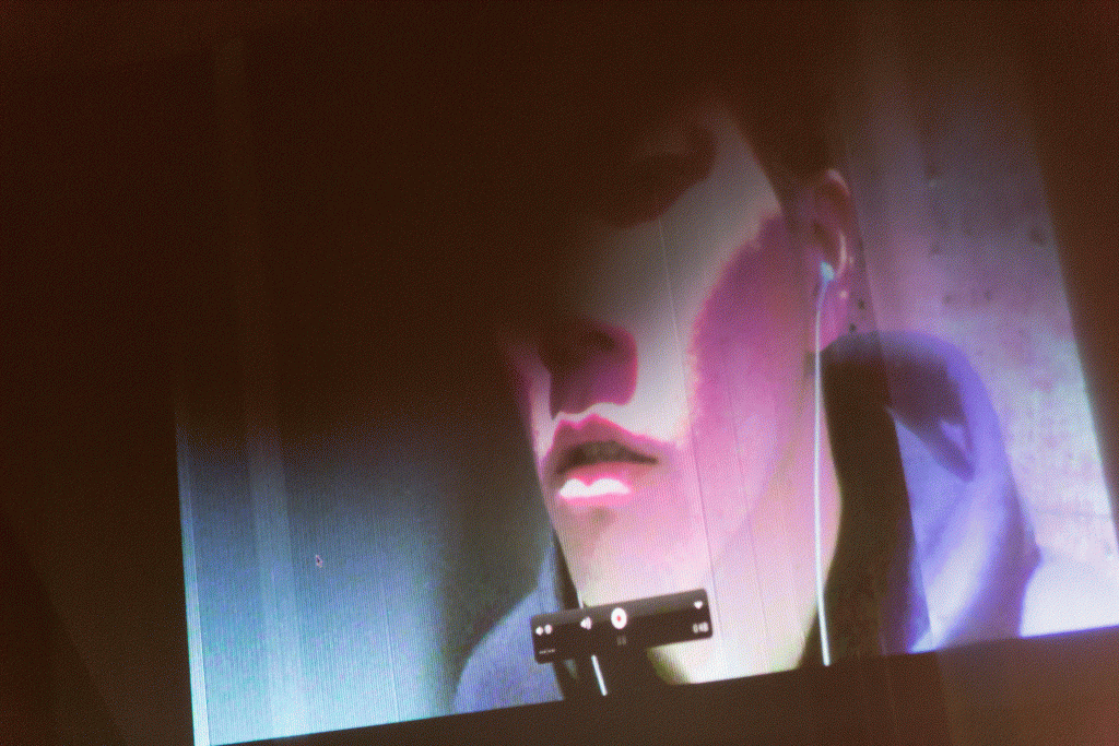 合唱が終わる。男の予約電話と、応援団の無音8拍子だけが残される。散発的に映像中の男がビートボクシングする。養生シートに速いスプレー音の反復が響き、また止まる。散漫な時間が続く。