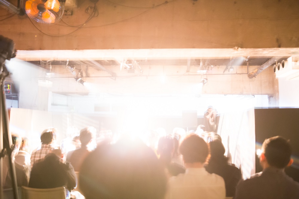 まちがいなく演奏をしているのに、その姿が見えないのは、ステージを囲んでコの字状に黒い壁が立てられているからだ。メンバーはその背後で演奏しており、椅子に座った観客からは、その視線の向かう先を完全に邪魔されてしまっている。けれども、かれらが演奏する様子を見ている者が誰もいないわけではない。客席を囲む壁に沿って、一段だけ高くされた通路がぐるりと設けられており、記録のためだけにしては妙に多い人数のカメラマンたちが、そこを行き来しながら、バンドの演奏を自由に撮影しているのだ。
