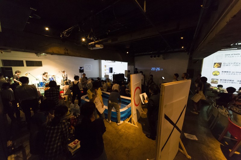 タイムテーブルと私の観測との関係は一見、コペンハーゲン解釈的ではある が、私の鼻にはそこに漂う清志郎の焼肉の匂いをかぎわける恣意的なセンサー も備わっている。こんなのどんなザルなセンサーでも捕捉せざるをえないだろ う。「○×クイズ」である。会場真ん中には簡易プール据え置かれている。アメ リカ横断ウルトラクイズで見たことのあるアレだ。20 時 28 分、瀬木俊がスー パーデラックスのフロアに駆け込んでくる。会場真ん中の○×パネルめがけて 走った彼は、不正解ということなのだろう、水の張ったプールが後ろに控える ○のパネルに突っ込み、プールの中で地味に前受け身をとる。20 時 30 分、観 客への指示は「拍手」である。